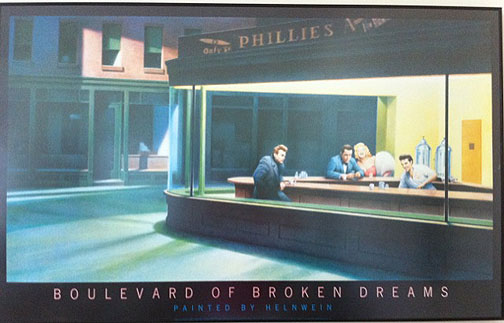 Por isso mesmo, anos depois, um sujeito chamado Gottfried Helnwein fez uma “releitura” de Nighthawks em forma de pôster. Ao fazê-la, deu-lhe um nome que eu julgo mais apropriado para a tela: Boulevard of Broken Dreams, ou, em português, rua dos sonhos perdidos.